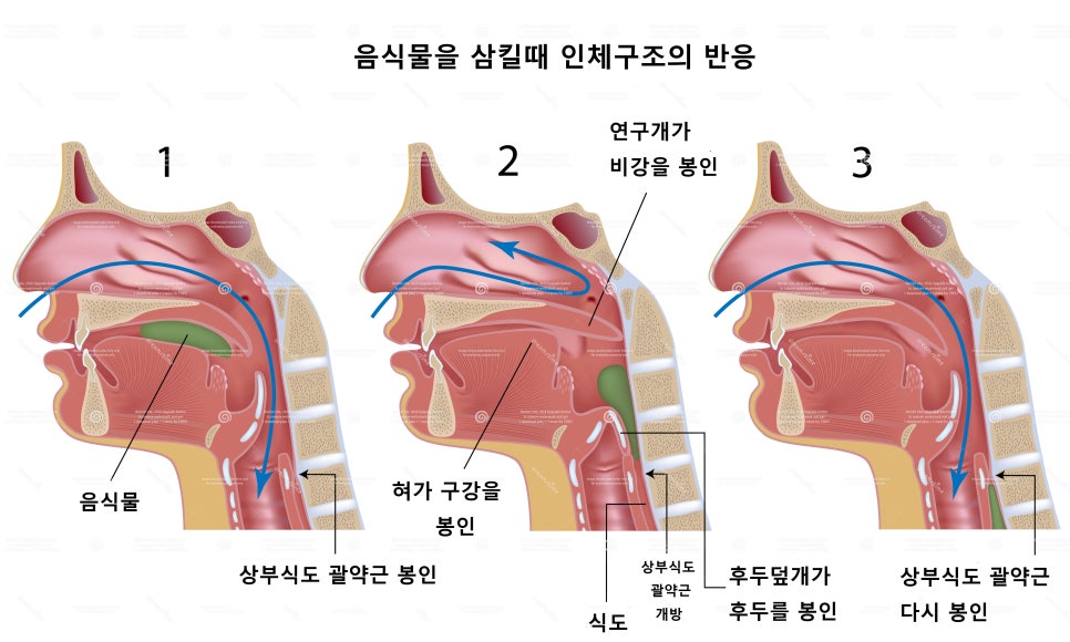 액체나 고체가 목구멍으로 넘어갈 때 후두의 입구에 있는 후두덮개가 닫히며 후두를 완전히 차단하고